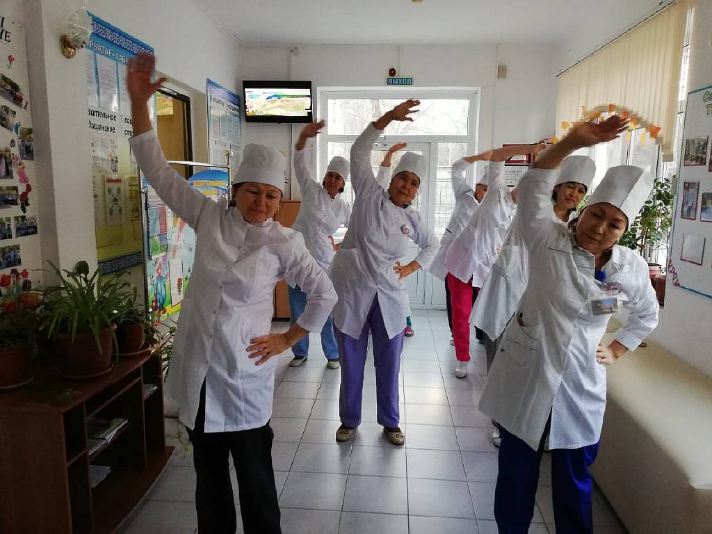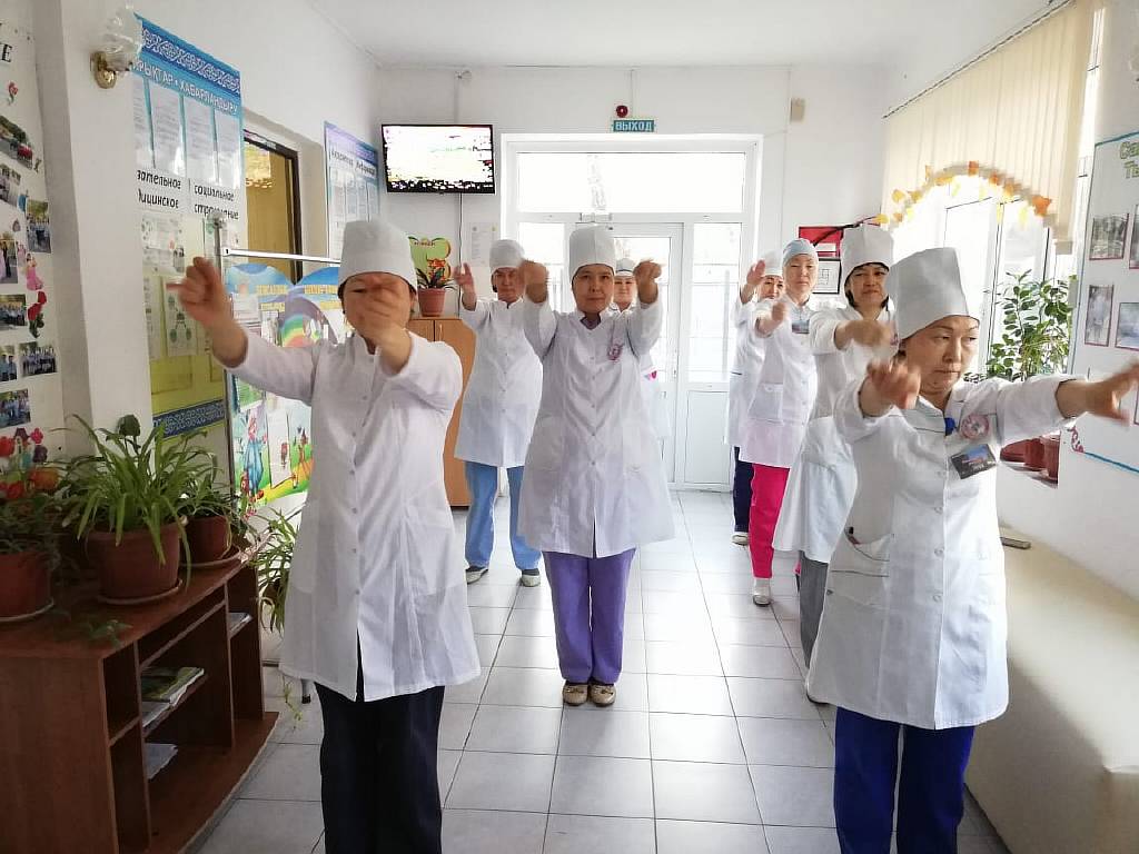 Атырау облыстық туберкулезге қарсы балалар санаториясында қызметкерлер күн сайын жұмыс уақытында бір реттік гимнастика жаттығулар жасауда.