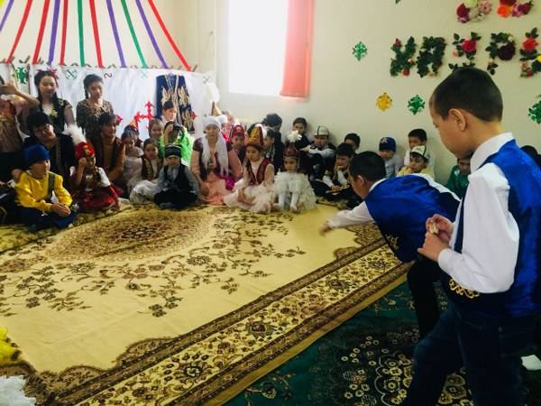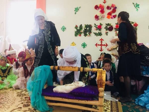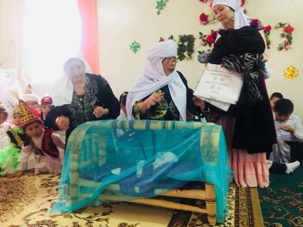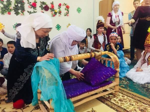 Ата-бабадан мирас болып келе жатқан салтымыз «Бесікке салу» дәстүрі көрсетілді. Ұлдар «Асық ату» ұлттық ойынын ойнады.